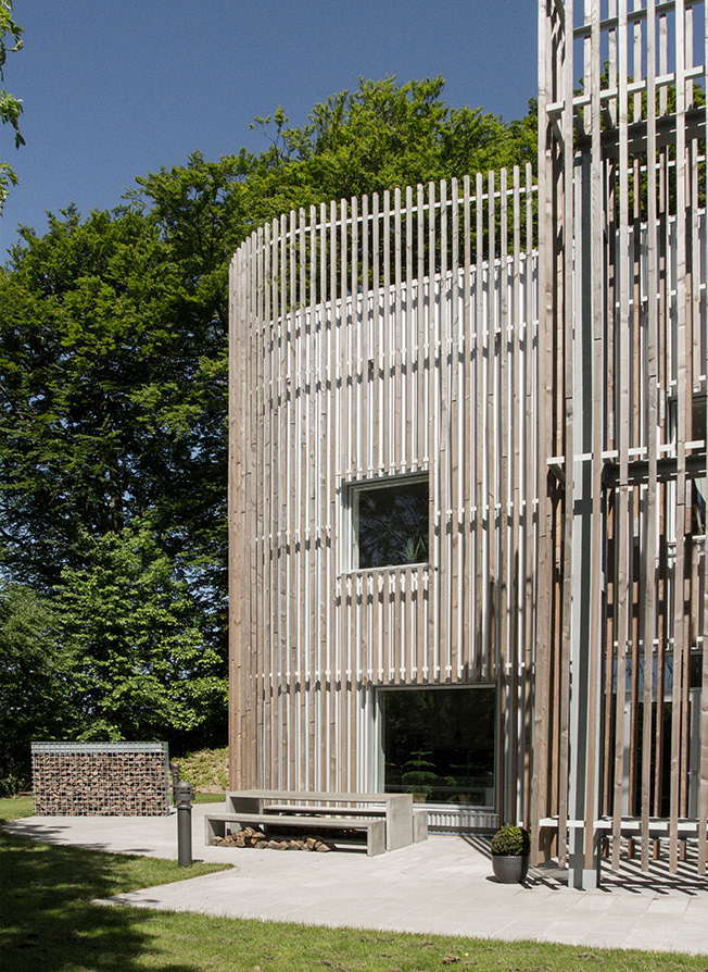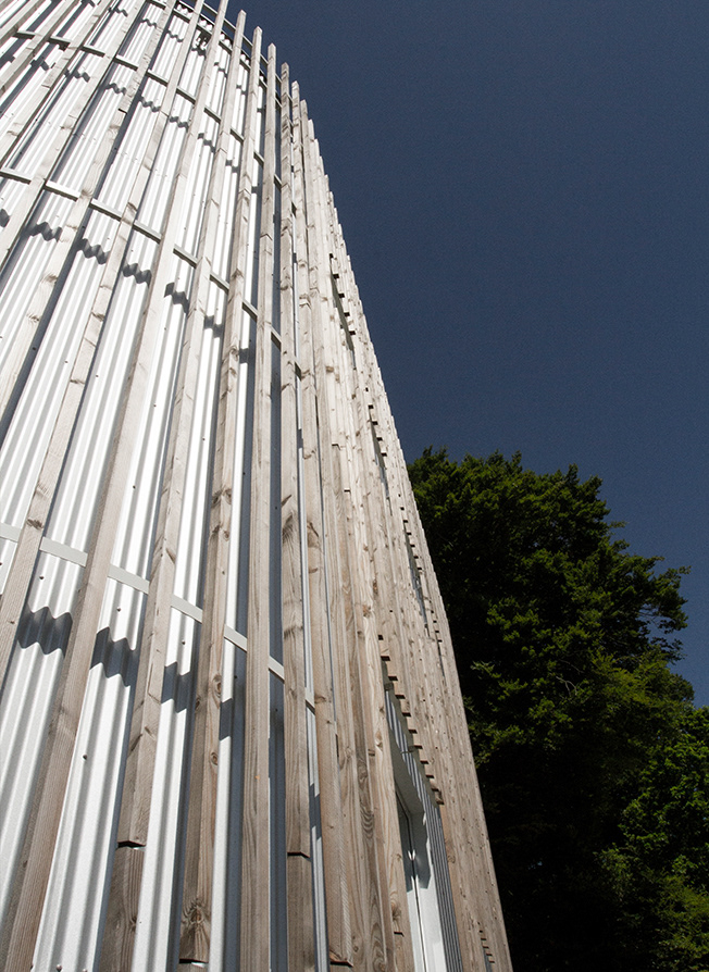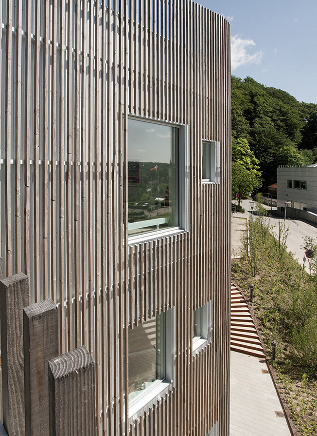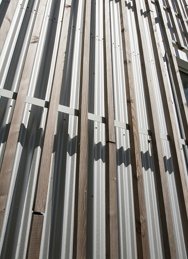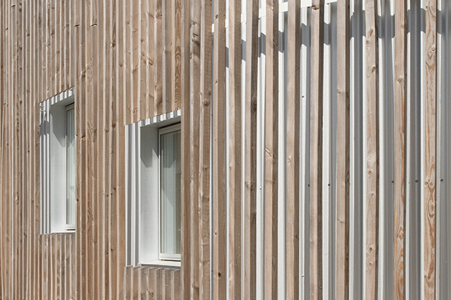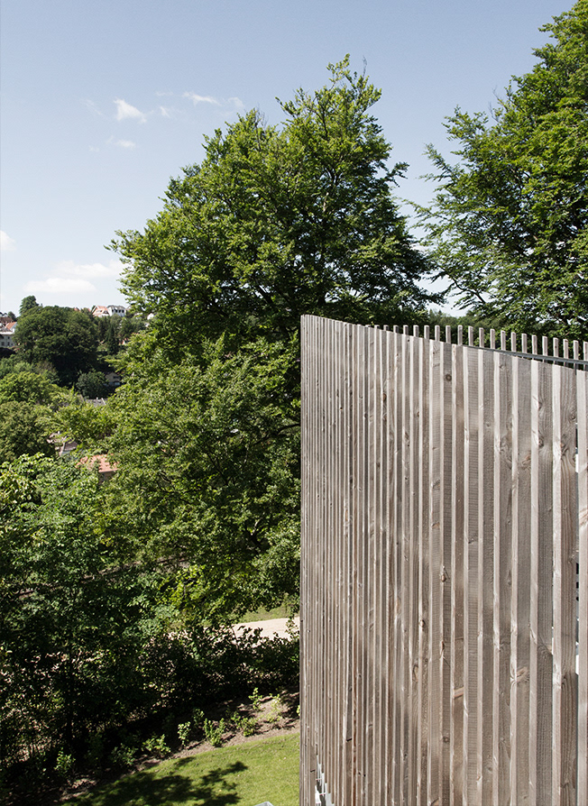 In elevation the vertical wooden slats make playful shadows on the bright aluminium and add a sense of depth to the façade. When you look along the façade the experience transforms into that of a total wooden building. This play between open and closed, wooden and aluminium generates a building that changes all the time depending on the angel you experience it from. This makes a vibrant and ever changing house.