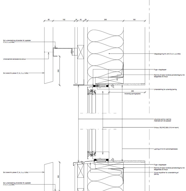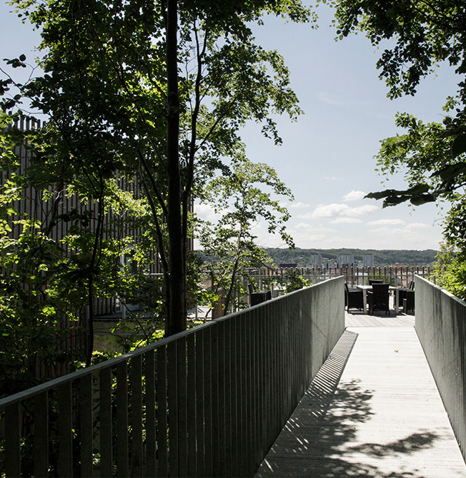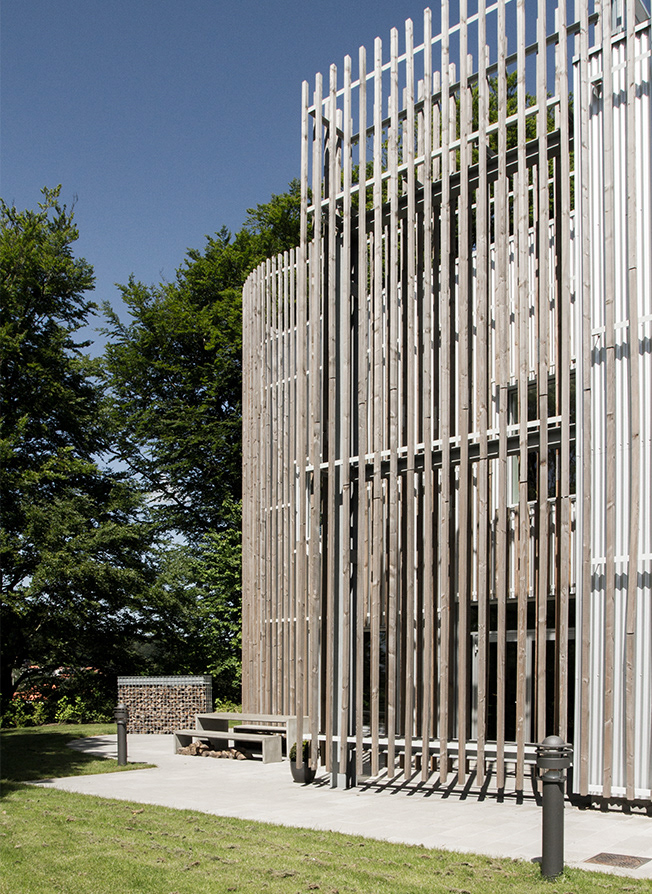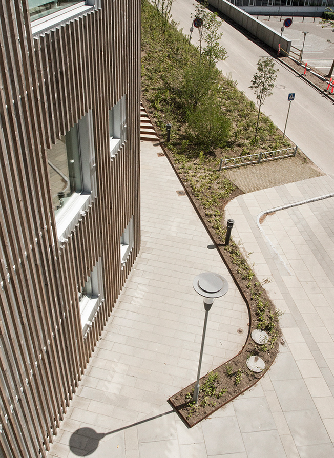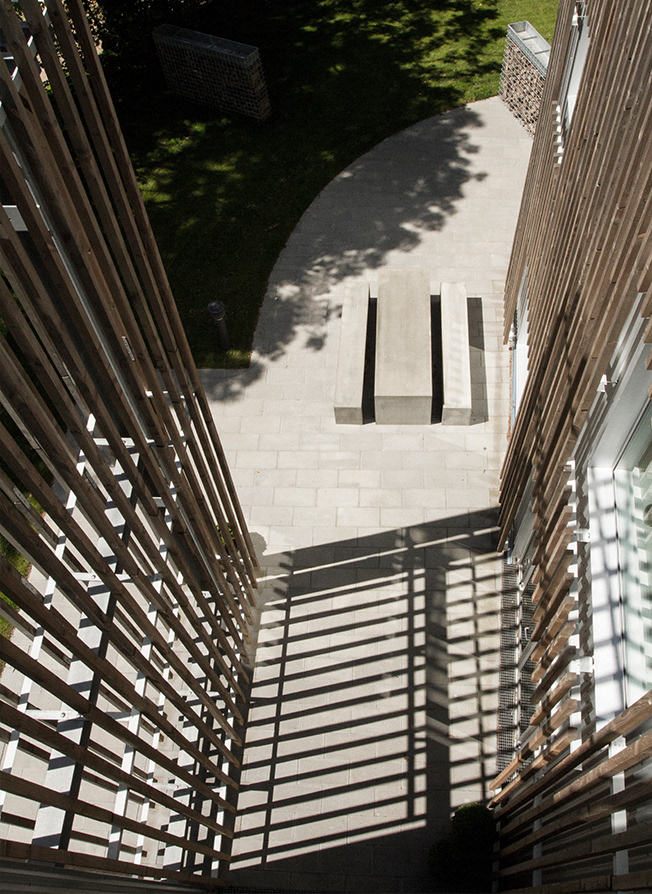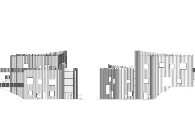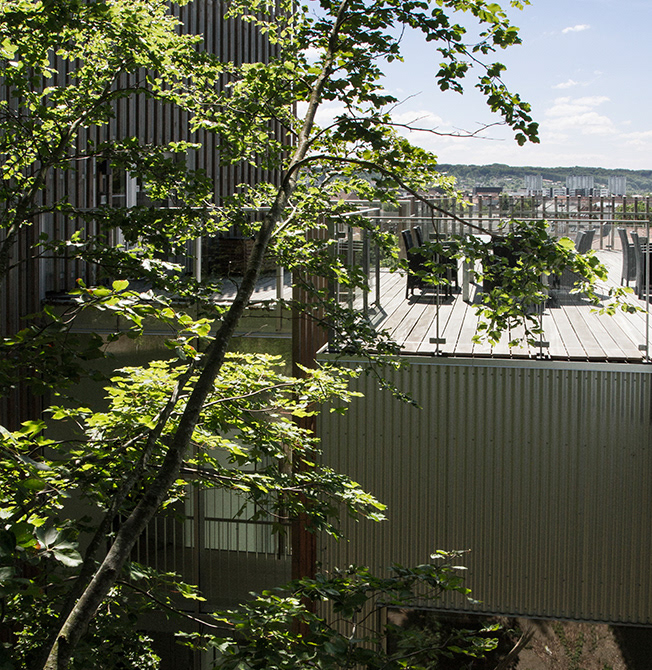 In elevation the vertical wooden slats make playful shadows on the bright aluminium and add a sense of depth to the façade. When you look along the façade the experience transforms into that of a total wooden building. This play between open and closed, wooden and aluminium generates a building that changes all the time depending on the angel you experience it from. This makes a vibrant and ever changing house.