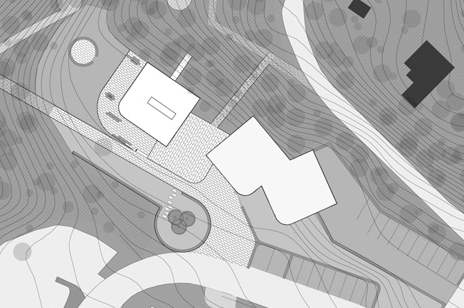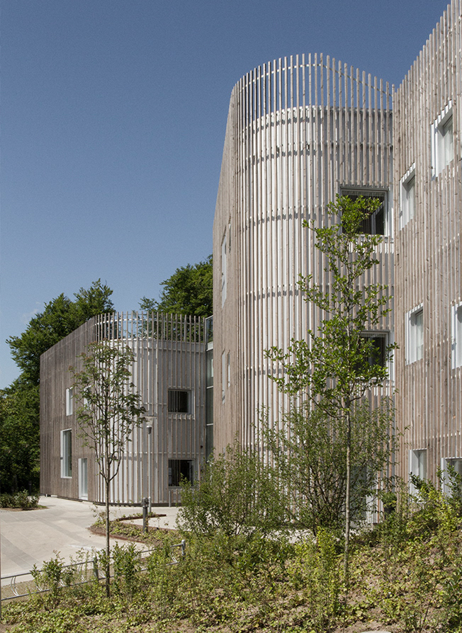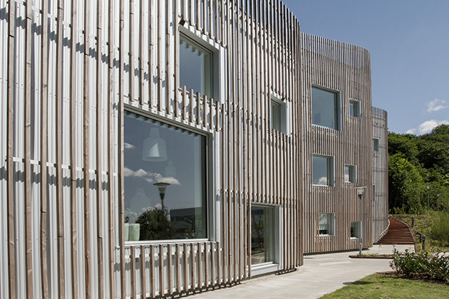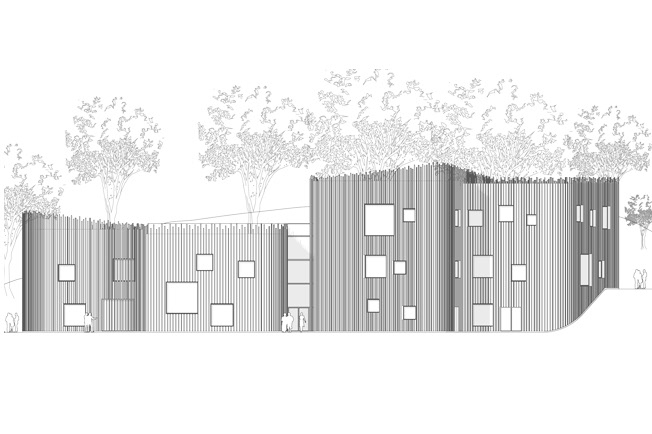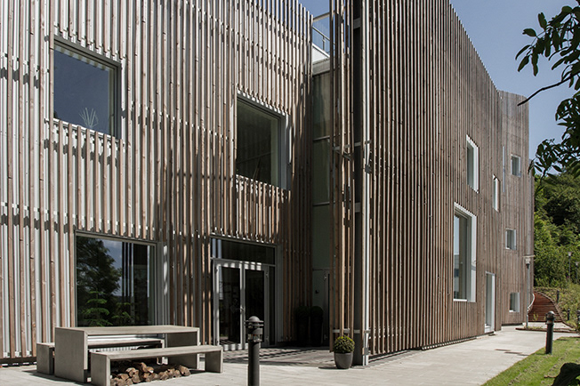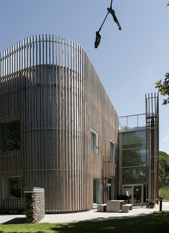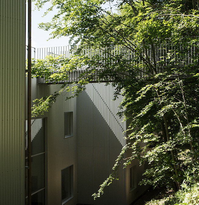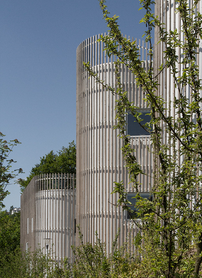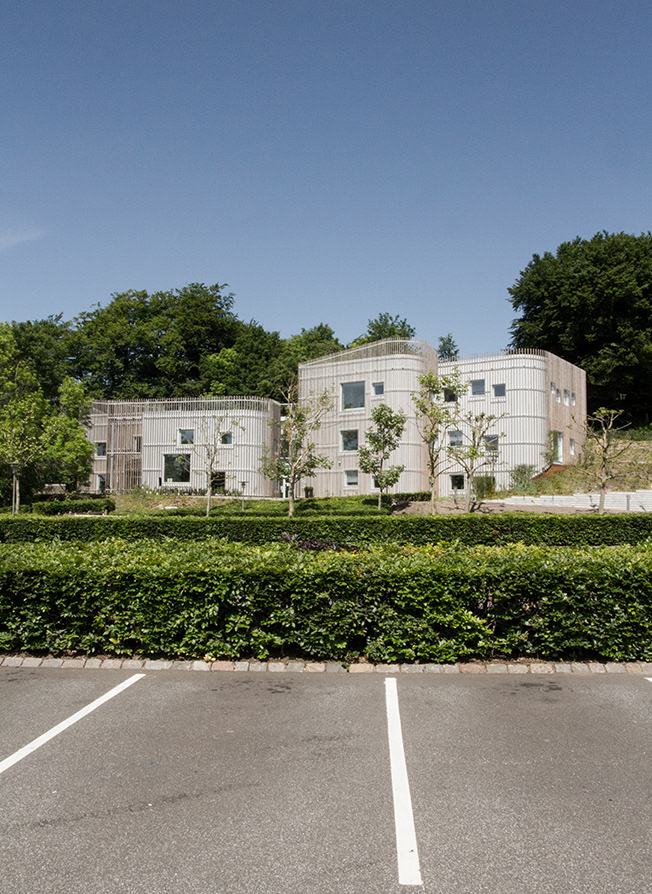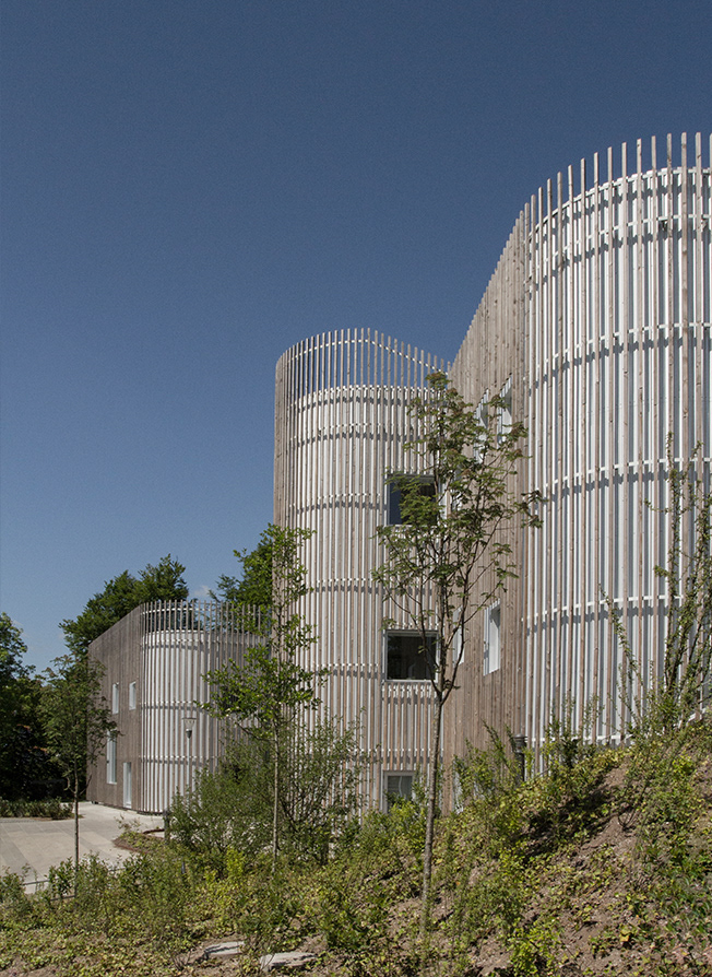 The house looks like it has grown out of the plots characteristic slopes and has inherited its soft organic shapes from the landscape. It gives both an inviting and dramatic appearance. From a distance it stands out as something unusual. The soft design and warm colours of larch tree is in close dialog with the green backdrop of the forest. Together, they stand in contrast to the hard concrete of the neighbouring hospital.