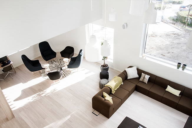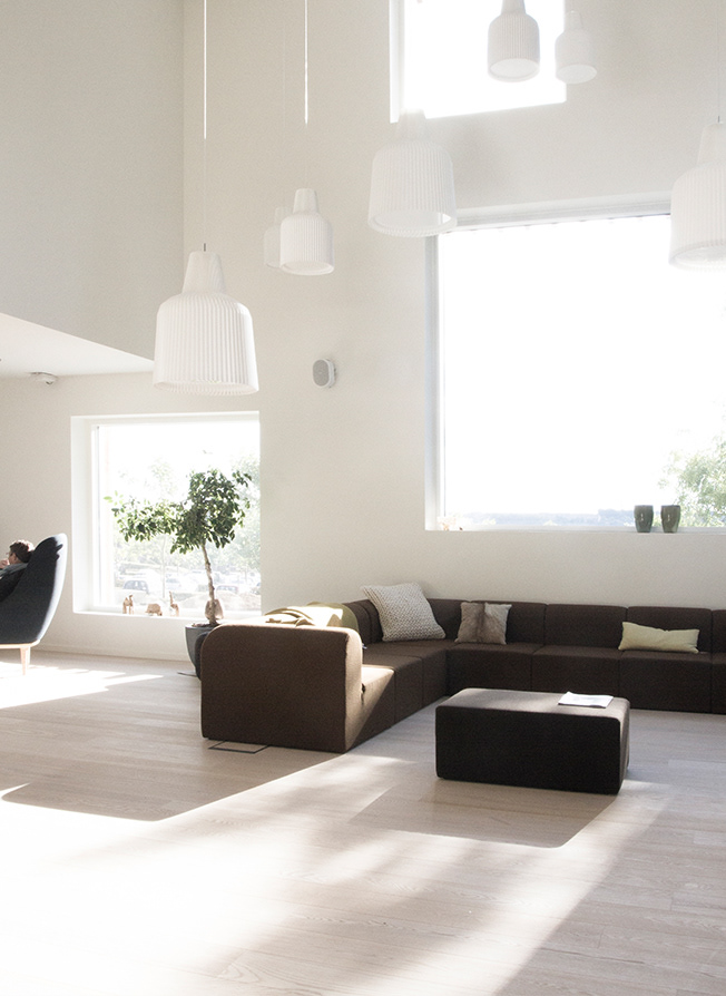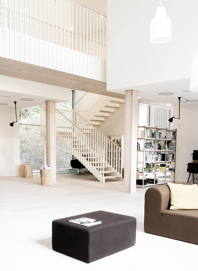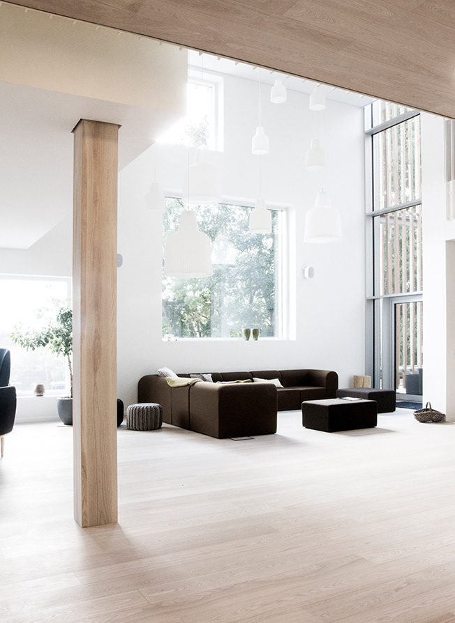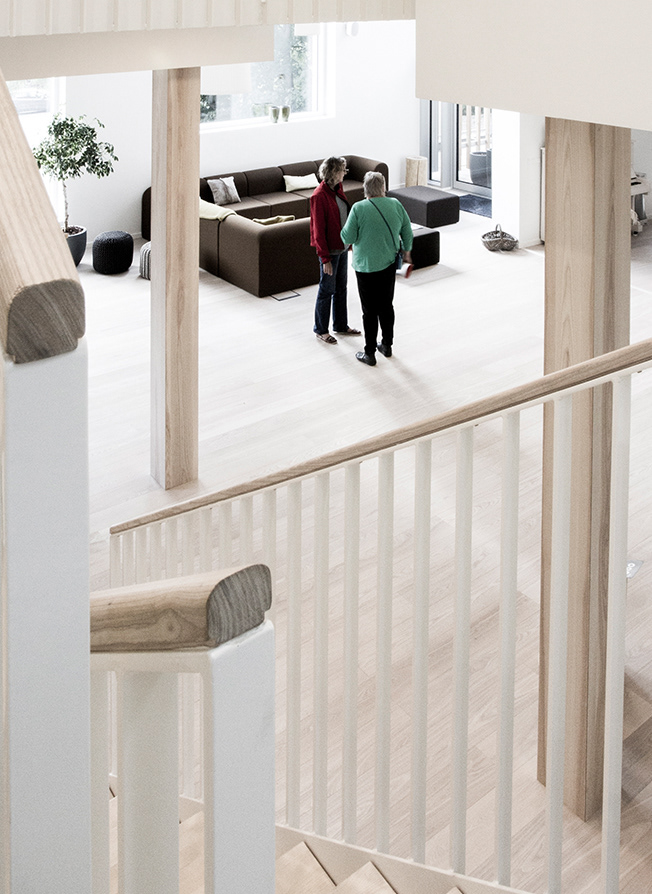 The forest and the trees follow the user into the house. The slats are visible through the big windows and the natural colour of the wooden ash floors and solid pillars gives a warm felling to the space. The central double-height common space receives natural light from all corners of the world. The light changes with the moods of the weather, the sun's position on the sky and all four seasons. The interiors are decorated in bright friendly colours. The space continuously changes nuances depending on light intensity and colours of the nature outside. The green and brown hue of the forest are mixed with the characteristic Scandinavian light. The low evening sun shines through the treetops and paints the tall south wall in golden tones.