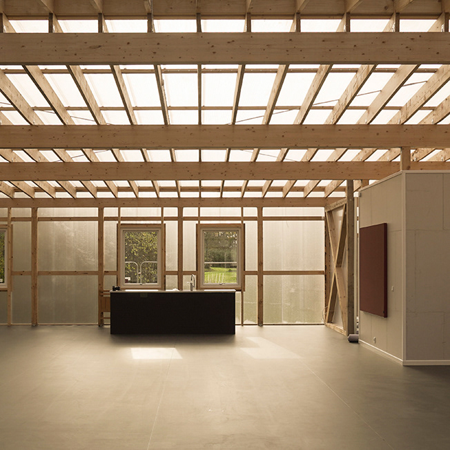 In Brøndby the building comprises both insulated and uninsulated spaces. The insulated spaces are designed as self-supporting room-sized modules each containing a function e.g. a music studio, editing suite and workshop. If the building is to be moved in the future the modules can be moved as a whole. The modules are connected by the common space which is uninsulated. The structure is made as an assembly kit. It is a contemporary interpretation of a classic half-timber construction with a load bearing structure made in timber and a climate screen in polycarbonate. It is a simple structure with only a few building layers - making it easy to construct and deconstruct - minimising the use of materials and labour costs. This strategy also enables easy maintenance as all components are easy to exchange and update and ensures that materials can be recycled as efficiently as possible at the end of the building's lifespan.